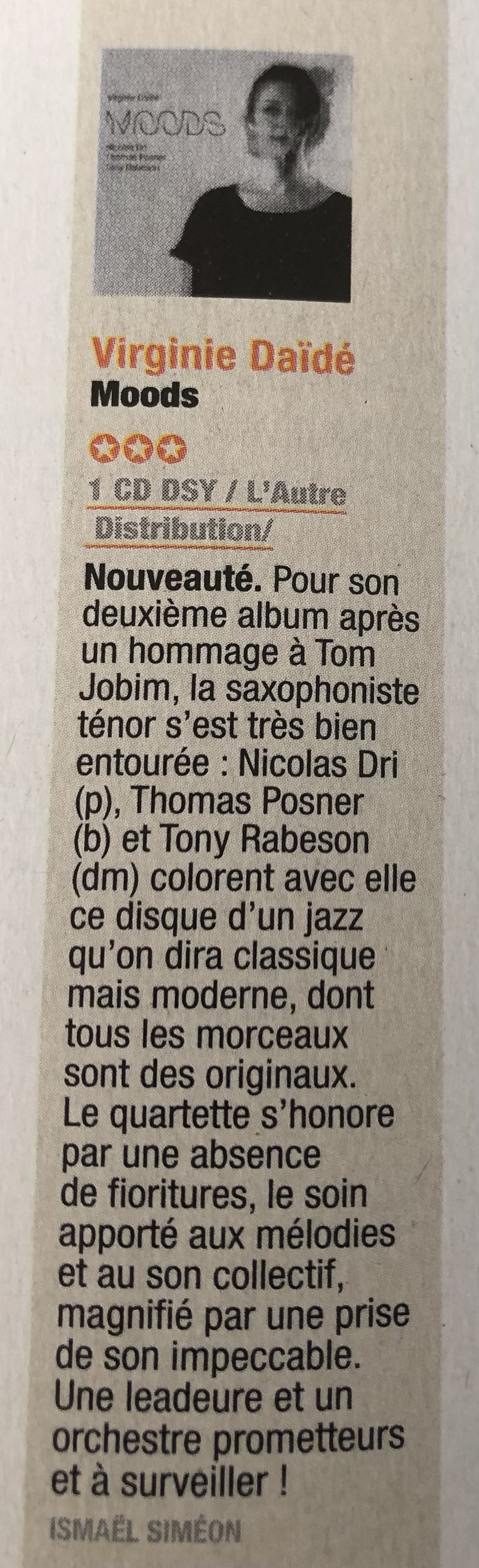 "Malgré sa pochette en noir et blanc, l’album ne manque pas de couleurs" « Moods »… entre rêve et réalité, entre ombre et lumière. Un jazz contemporain sensible et délicat, élégant et onirique.